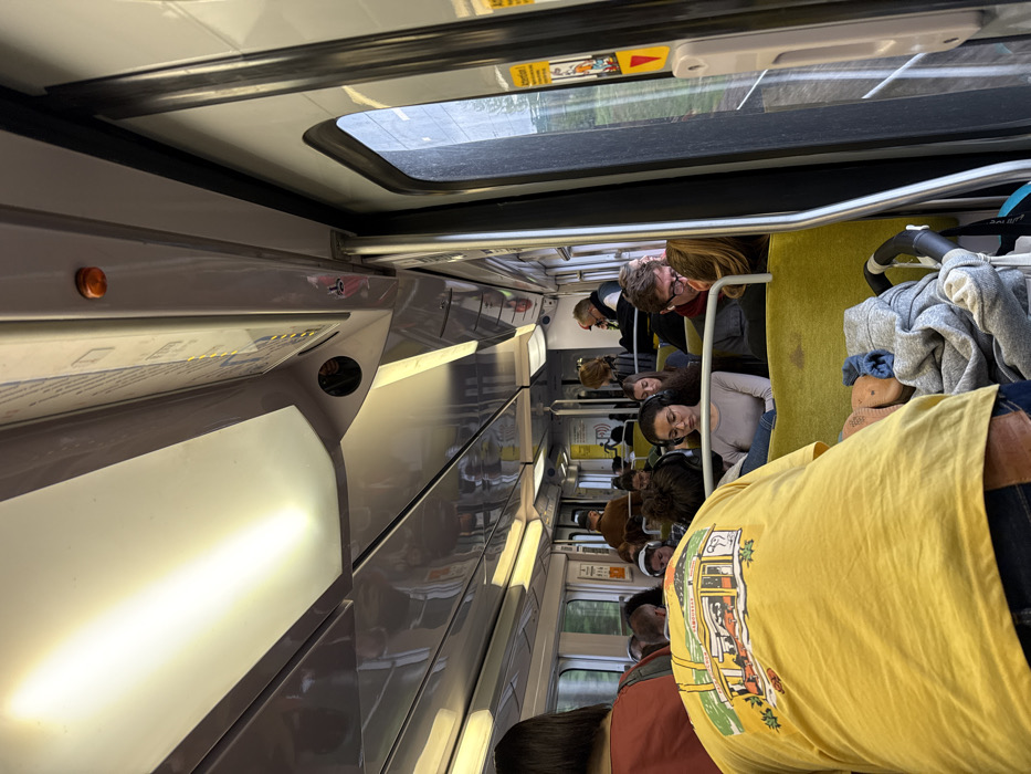 The interior of a train car in La Courneuve, France (48.922, 2.378). The train car is filled with passengers seated on yellow-padded benches. A man in a yellow shirt with a cartoon image of a food cart printed on it is standing facing the rear of the train car, facing the camera. Another man, wearing a red shirt and a face mask is standing near the front of the train car. Several other passengers are seated facing forward, their faces mostly obscured. A window to the right of the frame shows a view of trees and shrubs. The train car has an orange button located on the ceiling. The floor is clean and tiled. The train car is well-lit with several overhead lights. A baby stroller sits in the lower right corner of the frame. The train is moving with a slight vibration. A sign near the front of the train car indicates a stop. The scene is calm and quiet.
