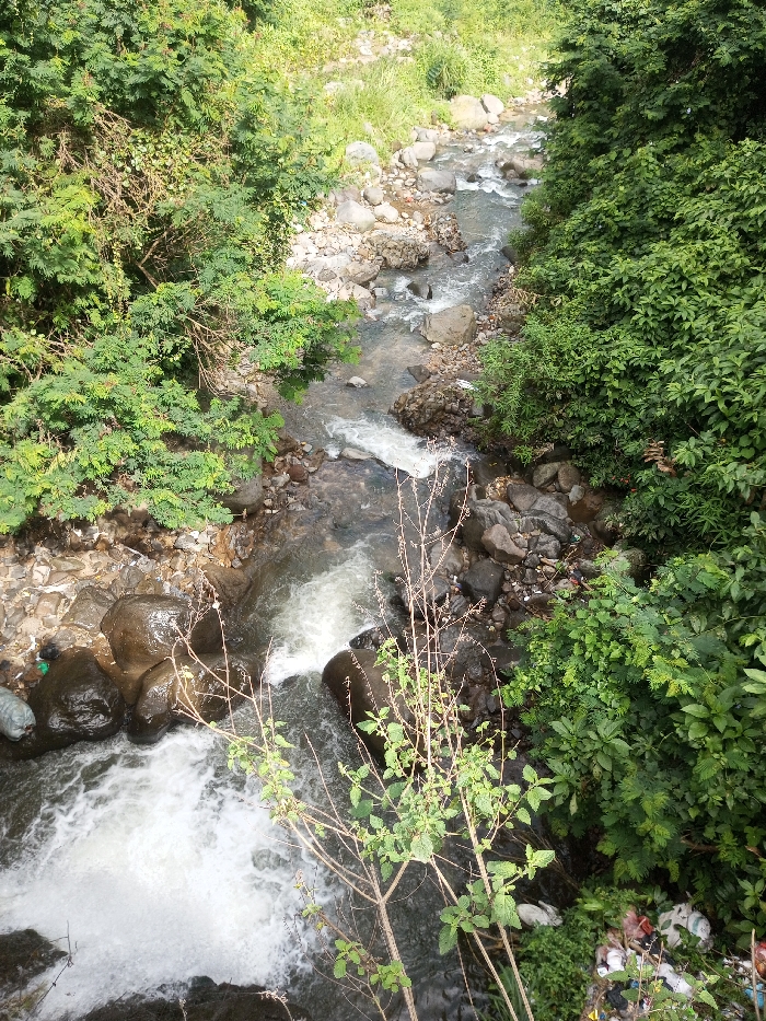 A cascading river flows between lush green vegetation. Boulders and rocks line the riverbed where the water churns white from the rapids. Sunlight shines on parts of the water and the greenery that surrounds the river. There is also trash along the riverside. A few bare branches extend over the frame.