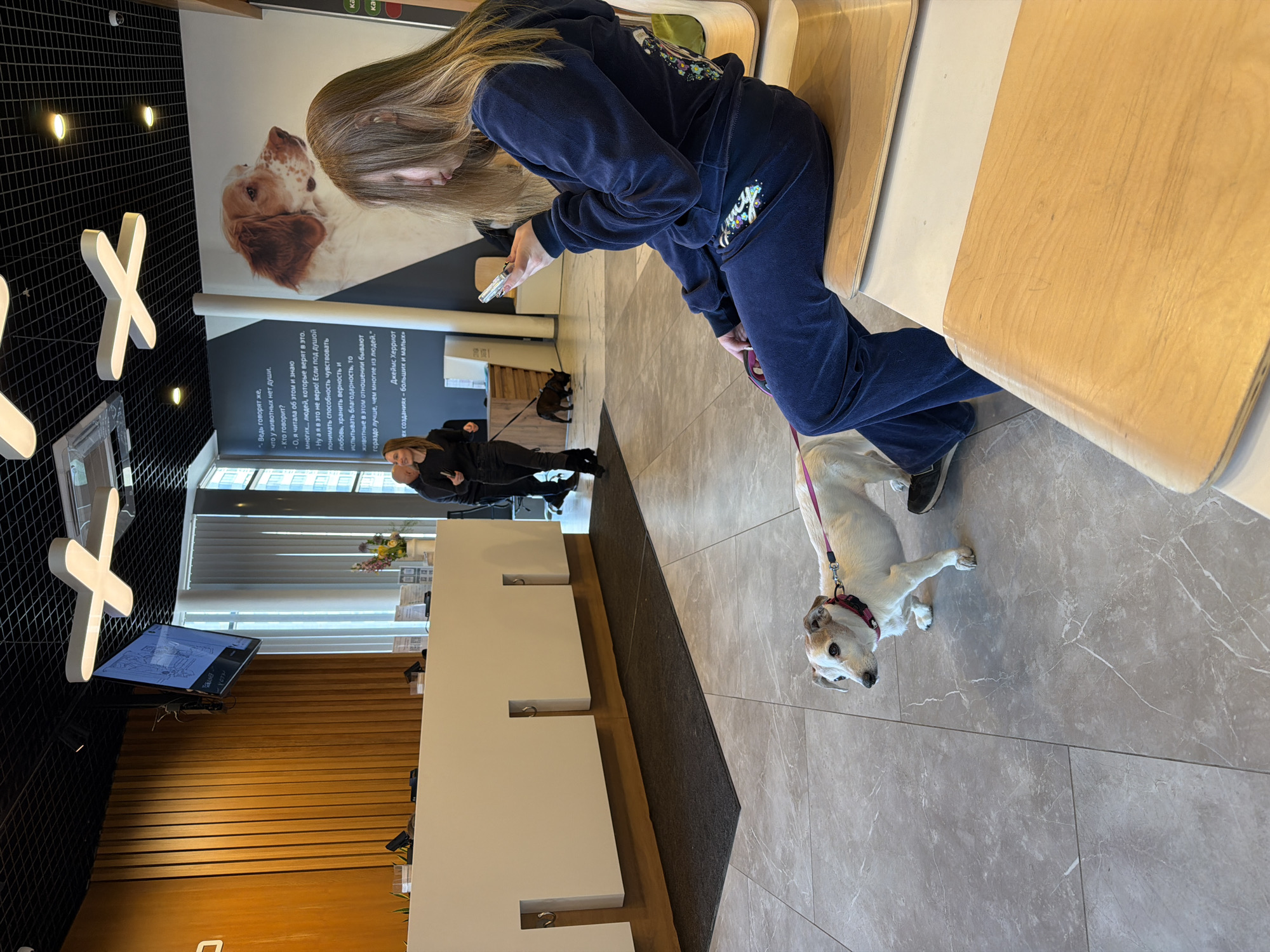 Here is a description of the image: The photograph, taken indoors, shows a light-skinned woman sitting on a wooden bench and looking at her cell phone. She is wearing a navy blue tracksuit. At her feet stands a small white dog with tan markings wearing a purple collar and leash. In the background are two dark-haired people, and a small black dog. The image is of the interior of the "Ле'муррр" pet shop in Saint Petersburg, Russia. The interior features marble floors, wooden slat walls, a black lattice ceiling with white "X" decorations, and a wall mural featuring a dog.