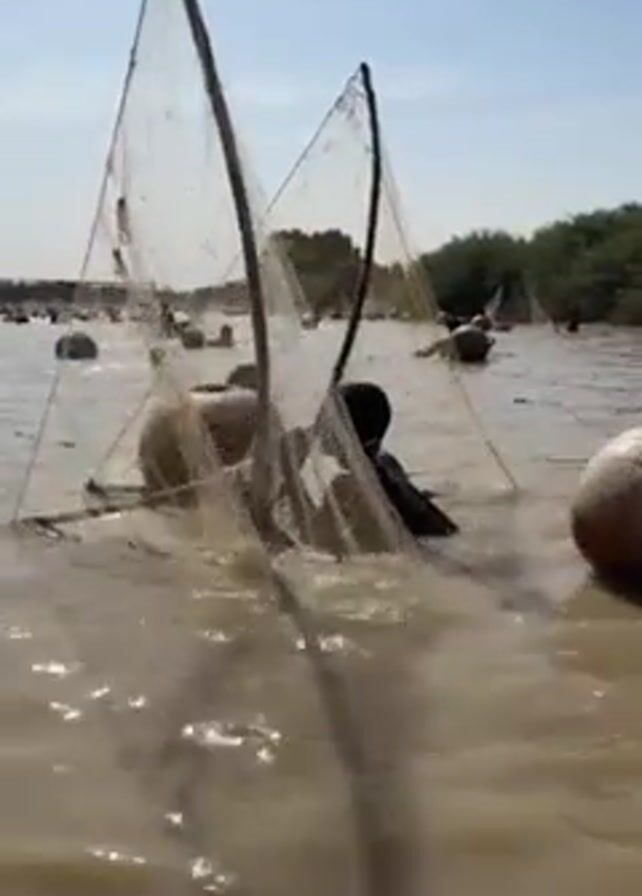 several people fishing with nets in a wide, muddy river under a clear sky. At least two people are visible in the foreground, wading through the water and manipulating large, frame-supported nets. Some individuals are submerged up to their chests, and buoys or floating devices are visible in the water. The river's edge features dense green vegetation. The overall scene portrays a traditional fishing practice in a natural environment.