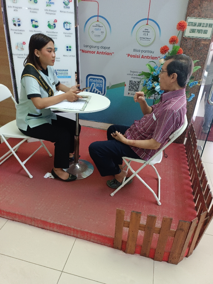 The image depicts an indoor public service area, likely a temporary or semi-permanent setup within a hospital or clinic, located in Margorejo, Indonesia
