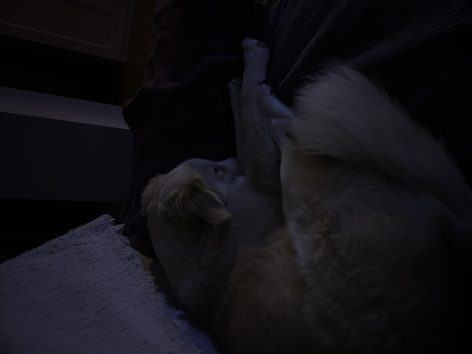 - "A light-colored dog, with cream or golden fur, is depicted sleeping, curled into a compact position on a dark-colored blanket or throw" by FM-waqA53, licensed under CC BY 4.0