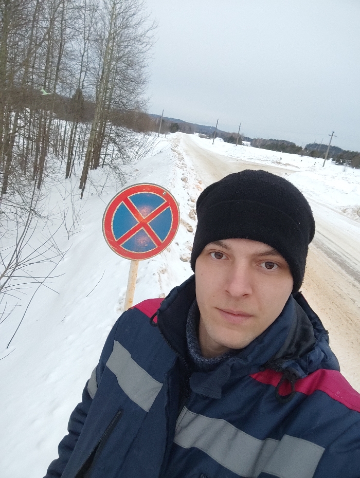 A male individual is depicted in a waist-up, forward-facing portrait against a winter landscape in Svetlyi, Russia. He wears a black knit beanie, a dark blue winter jacket with red shoulder accents and two horizontal grey reflective stripes across the chest and upper arms, and a grey knitted neck warmer. His expression is neutral, and he looks directly into the camera. To his left, slightly behind him, stands a circular "No Stopping" road sign (red circle, blue interior, red diagonal cross), mounted on a light-colored post partially obscured by accumulated snow. The background features a snow-covered dirt or gravel road extending into the distance, flanked by high snowdrifts. Bare deciduous trees with light-colored trunks line the left side of the road. An overcast, light grey sky dominates the upper portion of the frame. Utility poles are visible along the right side of the distant road. The environment is consistent with a rural or semi-rural winter setting.