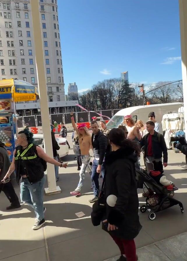 A crowd of people marches on a sunny day. The participants appear to be at a demonstration or rally, with signs visible in the middle of the crowd. A colorful, possibly carnival-like structure is on the left. Tall buildings loom in the background, and the march takes place in a paved outdoor area. The overall atmosphere seems active and energetic.