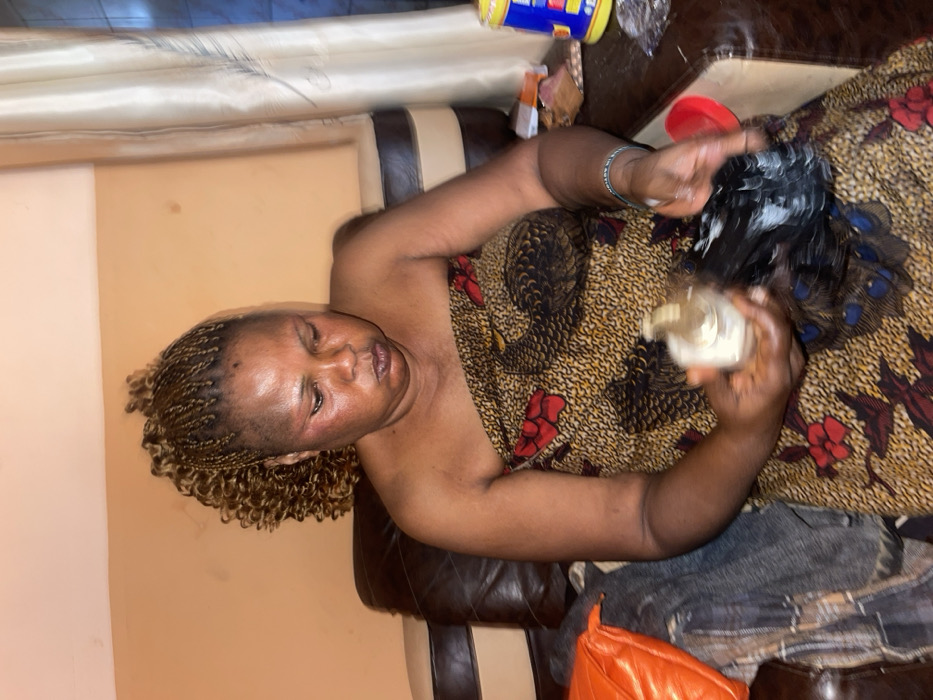 An adult female is depicted indoors, seated on a brown upholstered sofa in Unguwar Gabas, Nigeria. Her hair is styled in light brown braids forming a high ponytail with curly ends. Her face shows a swollen lower lip and red marks on her left cheek and forehead. She is draped in a patterned fabric, potentially a wrapper, featuring peacock and floral designs in brown, gold, red, and black, leaving her upper torso exposed. Light blue beaded bracelets are visible on her right wrist. In her left hand, she holds a small, clear bottle with a white pump dispenser, while her right hand holds a clump of dark, wet hair, possibly a wig or extensions, visibly coated with a white product. Her gaze is directed downwards towards these items. To her left on the sofa rests an orange handbag and a folded grey and white plaid garment. The background features a tan wall, a window with a light curtain displaying a dark feather motif, and a surface to her right holding a yellow and blue container, a red object, multiple small brown packets, and a clear plastic bag containing dark items.