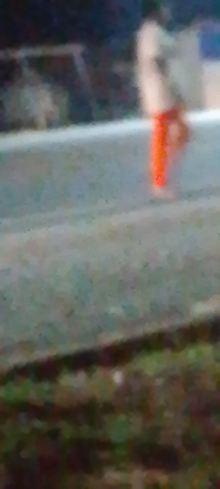 The image depicts a single, unidentified human figure positioned on a paved surface in Zango-ndaji, Nigeria. The figure, seen under extremely low-light and blurry conditions, appears to be in motion, wearing a light-colored upper garment and bright orange lower garments. The grey paved surface extends through the midground. The immediate foreground consists of dark, indistinct ground cover. The background is dark and shows blurry, undifferentiated masses, consistent with distant structures or dense foliage. No other individuals, distinct objects beyond clothing, or specific interactions are discernible within the frame.