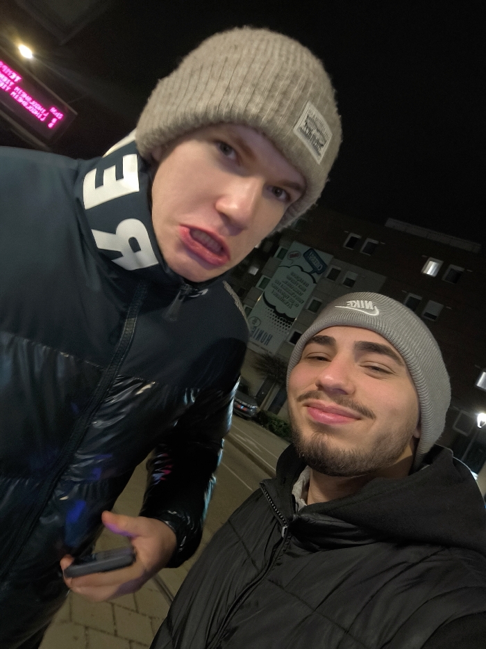 - "Two young men pose for a selfie outdoors at night" by FM-NIq6z1, licensed under CC BY 4.0