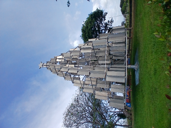 An unusual, geometric Christmas tree stands outdoors on green grass. The tree is constructed from metal frames and numerous rectangular, gray panels arranged in a tiered, triangular shape. A star tops the structure against a blue sky with scattered clouds. Trees, shrubbery, and foliage surround the base, adding to the outdoor setting.