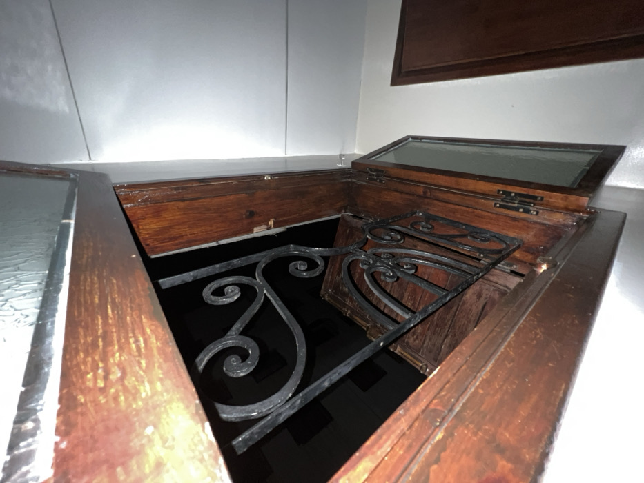 This image, taken from an interior perspective in Casablanca, Morocco, depicts an open, dark brown wooden ventilation opening or window, viewed at an upward and outward angle. A black, ornate wrought iron security grill, characterized by scrolled and geometric patterns, is affixed within the opening. The wooden frame exhibits signs of wear, including minor abrasions and discoloration. Beyond the grill, the exterior environment is uniformly dark and indistinct, indicative of nighttime or a poorly lit area. The interior features light-colored walls, appearing white or off-white, with the section to the immediate right of the opening showing horizontal grout lines consistent with tiling. On the far right, a dark brown wooden doorframe and a portion of a closed dark brown wooden door are visible. The upper part of the opening contains a frosted or textured glass panel. Below this, two hinged dark brown wooden panels are swung open outwards, with metal hinges visible on the right side of the lower right panel. No individuals are present, and no specific actions or interactions are occurring.