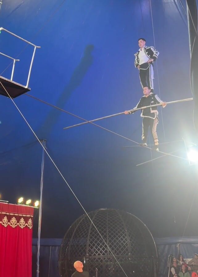 The scene captures a circus performance featuring two tightrope walkers. One acrobat is standing on the shoulders of another, balancing precariously on a tightrope. The acrobat on the bottom holds balancing poles. Both performers are dressed in matching black and white outfits. The blue tent ceiling looms above, rigging is visible, and the bright stage lights illuminate the performance. Below them is a large metal globe-like structure and a circus ringmaster dressed in black. The audience, partially visible, watches the performance with anticipation.
