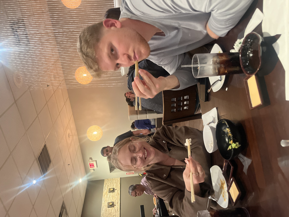 The image depicts an indoor scene within a restaurant, presumed to be located in West Windsor, United States; the specific venue is not visually identifiable. Two young adult individuals are seated at a dark wooden table in the foreground, engaged in dining. On the left, a female with blonde hair and glasses, wearing a brown jacket, smiles while holding chopsticks that grip a white food item. On the right, a male with short blonde hair and a light grey long-sleeved shirt holds chopsticks near his mouth, looking directly at the camera. The table between them holds multiple small dishes: several white and black bowls, one black bowl containing green food remnants, and white bowls, one with white rice. There are also rectangular plates with sauce, a clear glass with a straw containing a dark beverage, and a dark-colored smartphone. A white napkin and a metal fork are also present. In the mid-ground, a dark-haired adult male stands behind the female, facing away. To the far left background, another dark-haired adult male is seated at a table. Several other patrons are partially visible in booth seating in the background right. The restaurant environment features a dropped ceiling with recessed lighting and spherical pendant lights with a woven appearance. An "EXIT" sign with red lettering is visible above a doorway on the left. A decorative wall feature with three illuminated recesses is on the left, and a vertical shimmering beaded curtain or light fixture is on the right. Dark wooden chairs with cutout designs are visible.