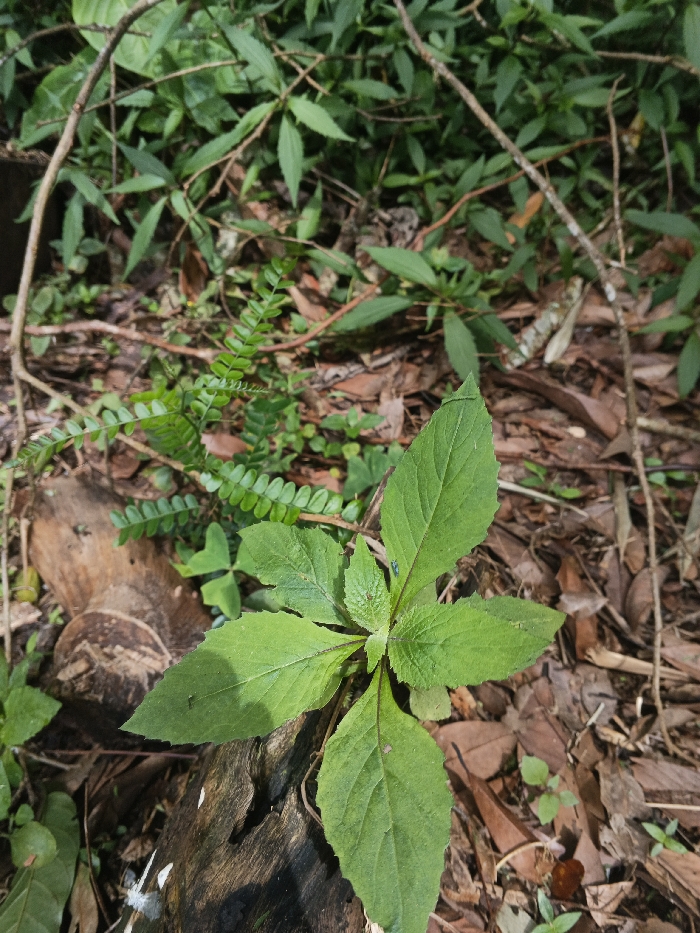 The image depicts a close-up view of the forest floor in Baglung, Nepal. A central herbaceous plant with seven broad, green leaves occupies the foreground, with a small, iridescent bluish-green insect visible on one of its leaves. To the left, a section of a dark brown, textured tree stump or fallen log is partially visible. Behind the central plant, a bright green fern with numerous small, oblong leaflets extends horizontally. The ground is covered by a layer of dried brown leaves, fallen twigs, and various small green plants and sprouts. The background consists of dense green foliage and intertwining thin branches, indicative of a lush undergrowth. Sunlight filters through an unseen canopy, creating varied illumination across the scene. No human subjects or active interactions are observed.