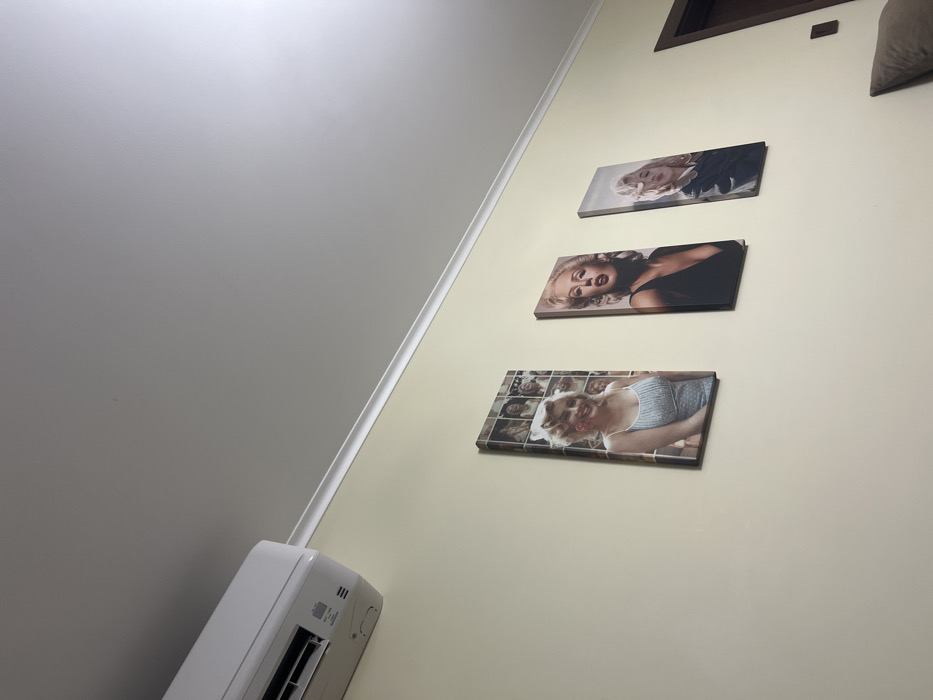 This image depicts an interior scene in a room located in Haskovo, Bulgaria. The upper portion of the frame shows a white ceiling and a light beige wall, separated by white crown molding. A white split-system air conditioning unit is mounted on the upper left section of the wall. Below the air conditioning unit and to its right, three vertical canvas prints featuring Marilyn Monroe are displayed on the wall. The leftmost print shows a smiling Marilyn Monroe in a light top against a collage background of her images. The central print features Marilyn Monroe with an open mouth, wearing a dark top. The rightmost print displays Marilyn Monroe with a slight pout, wearing a dark jacket. A dark brown doorway is partially visible on the far right, and a dark, rectangular wall fixture (possibly a light switch or outlet) is present on the wall between the rightmost print and the doorway. A dark cushion or pillow is partially visible in the bottom right corner of the frame.