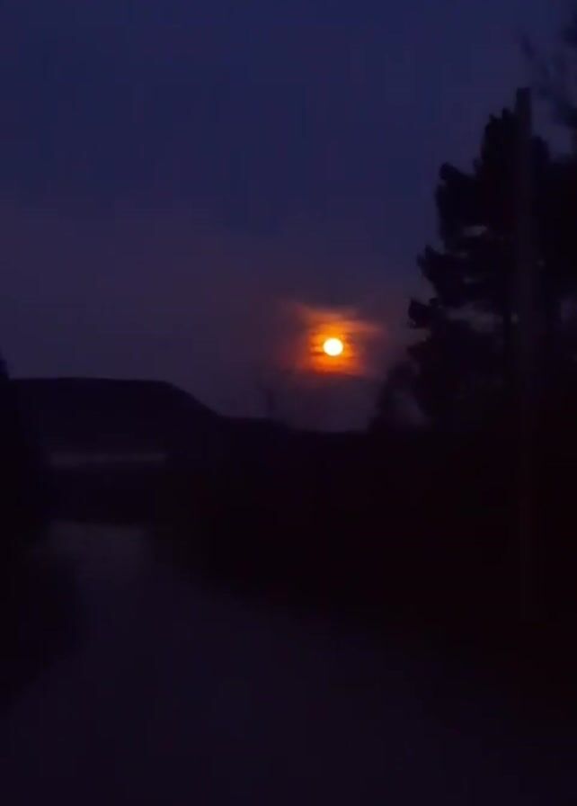 full moon in the night sky, glowing orange behind a thin layer of clouds. Silhouetted trees are visible to the right of the frame, and a dark landscape stretches across the bottom of the image. The sky is a dark blue, suggesting either early morning or late evening. The moon is the dominant element, its light casting a soft glow on the clouds surrounding it.