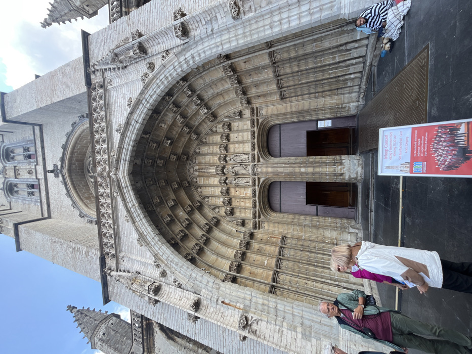 The image depicts the main entrance of St. Bavo's Cathedral in Ghent, Belgium, viewed from a low angle. The Gothic cathedral facade, constructed of light-colored stone, features a large, deeply recessed pointed archway serving as the primary portal. The archway contains two dark wooden doors, both slightly ajar, and is adorned with multiple tiers of stone carvings and niches containing religious figures. Above the entrance, the cathedral's main tower rises, showing additional windows and decorative stonework against a partially blue, partly cloudy sky. On the left side of the foreground, three individuals are present. One older male, wearing a green jacket over a red shirt and dark trousers, with a camera around his neck, stands facing towards the right. Partially behind him, an older female in a pink top is visible. To her right, another older female in a white and brown jacket and dark trousers stands with her back mostly to the camera, looking towards the cathedral entrance or the sign. In the center foreground, a vertical, rectangular sign advertises an "Inloop Concert" at "Sint Baafskathedraal - Gent" for Friday, November 5, 2021, at 15:30. The sign includes a stylized image of the cathedral and a photograph of a choir. To the right of the cathedral entrance, an access ramp, dark in color, extends from the doors down to the ground level. Further to the right, an individual is seated on the ground against the cathedral wall, wrapped in a black-and-white striped blanket and a lighter-colored blanket. A backpack is visible next to them. The ground in the immediate foreground is dark pavement.
