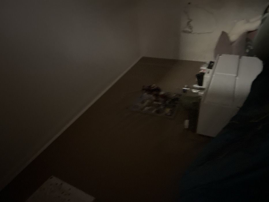 A dimly lit room reveals a corner with cream-colored walls and brown flooring