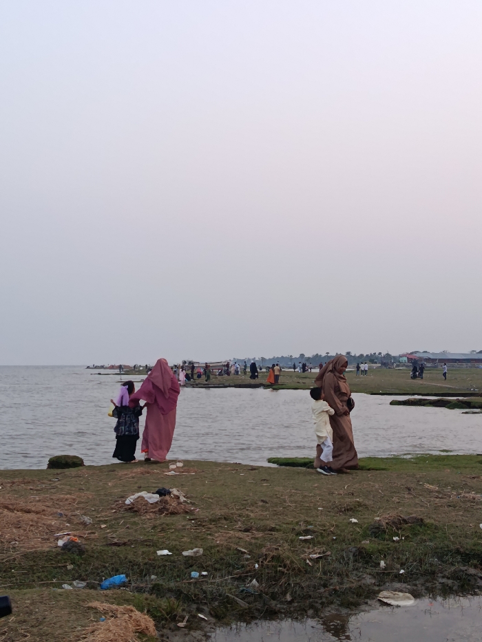 The scene depicts a waterside area in Charfasson Sadar, Bangladesh. The foreground consists of uneven, grassy terrain mixed with patches of exposed soil and several small puddles, notably featuring scattered refuse including plastic bags and other debris. In the midground, near the water's edge, an adult female in a maroon full-length garment and head covering stands with her back to the camera, accompanied by two children. One child, wearing a dark patterned dress and purple head covering, stands beside her, while a smaller child in yellow is partially visible, appearing to be held. To their right, an adult female in a light brown full-length garment and head covering faces left, with a young male child in light-colored clothing standing close to her side, his back to the camera. The background features a broad body of water, likely a lake or river, extending horizontally. The distant shoreline is populated by numerous individuals, appearing as a gathering, with some sparse vegetation and faint structures visible. The sky is a uniform pale grey-blue, suggesting diffused daylight, possibly late afternoon or overcast conditions.