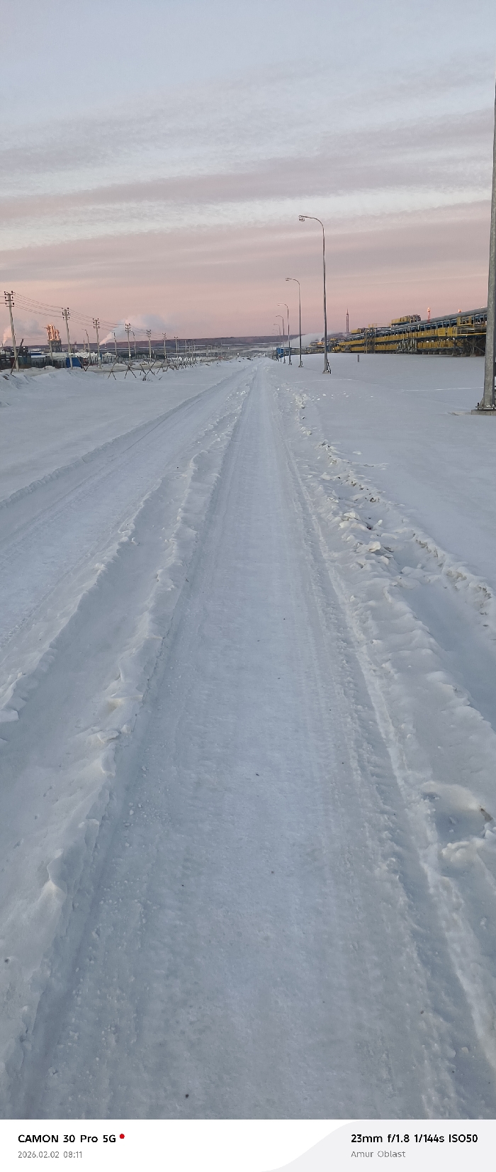 A snow-covered road stretches into the distance beneath a pastel-colored sky, likely at dawn or dusk. Tire tracks are visible in the snow, suggesting recent vehicle passage. Industrial structures and utility poles line the horizon, indicating an industrial area or edge of a town. The scene is captured on a CAMON 30 Pro 5G camera with settings 23mm f/1.8, 1/144s, and ISO50 in Amur Oblast on February 2, 2026, at 8:11 AM.