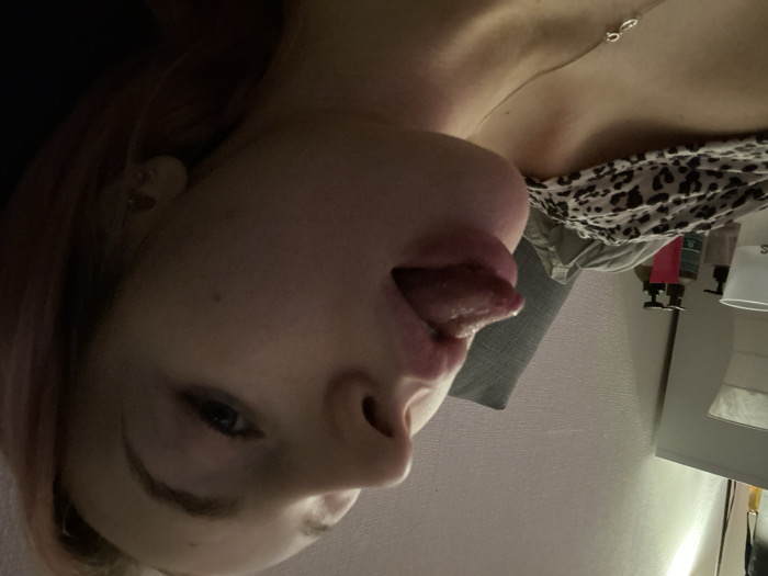A woman is positioned looking down at the camera, her head tilted back with her tongue extended out of her mouth