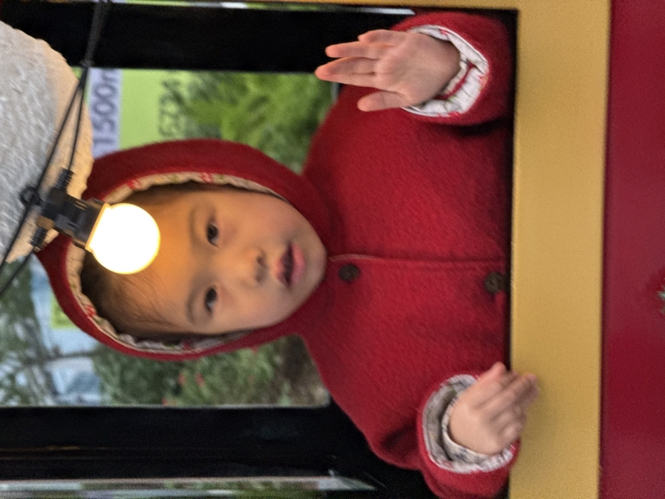 A young East Asian child is depicted from the chest up, positioned within a red and yellow structure, possibly a miniature vehicle or play enclosure