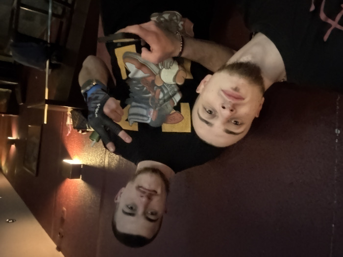 Two males are depicted in an indoor setting, likely a bar or lounge, with dim lighting and dark walls. The specific location within Sliven, Bulgaria, cannot be determined from the image. The male on the left, positioned closer to the camera, has a shaved head, a short dark beard and mustache, and is wearing a black t-shirt with a partial pink graphic. He looks directly forward with a neutral expression. The male on the right has short dark hair and a faint beard shadow. He is wearing a black t-shirt featuring a graphic of stylized sneakers with partially visible "OFF" text. His right hand is raised, forming a "peace" sign, and is covered by a black and blue fingerless glove. His left hand holds a dark-colored smartphone or small object. He looks towards the camera with a slight smirk. In the background, a dark-colored, possibly purple, textured wall is visible, illuminated by several wall-mounted sconces emitting warm, orange light. To the right, a dark high-top table, dark stools, a clear glass with a straw and dark liquid, and a small brown bag are present. A framed object hangs on the far right wall.