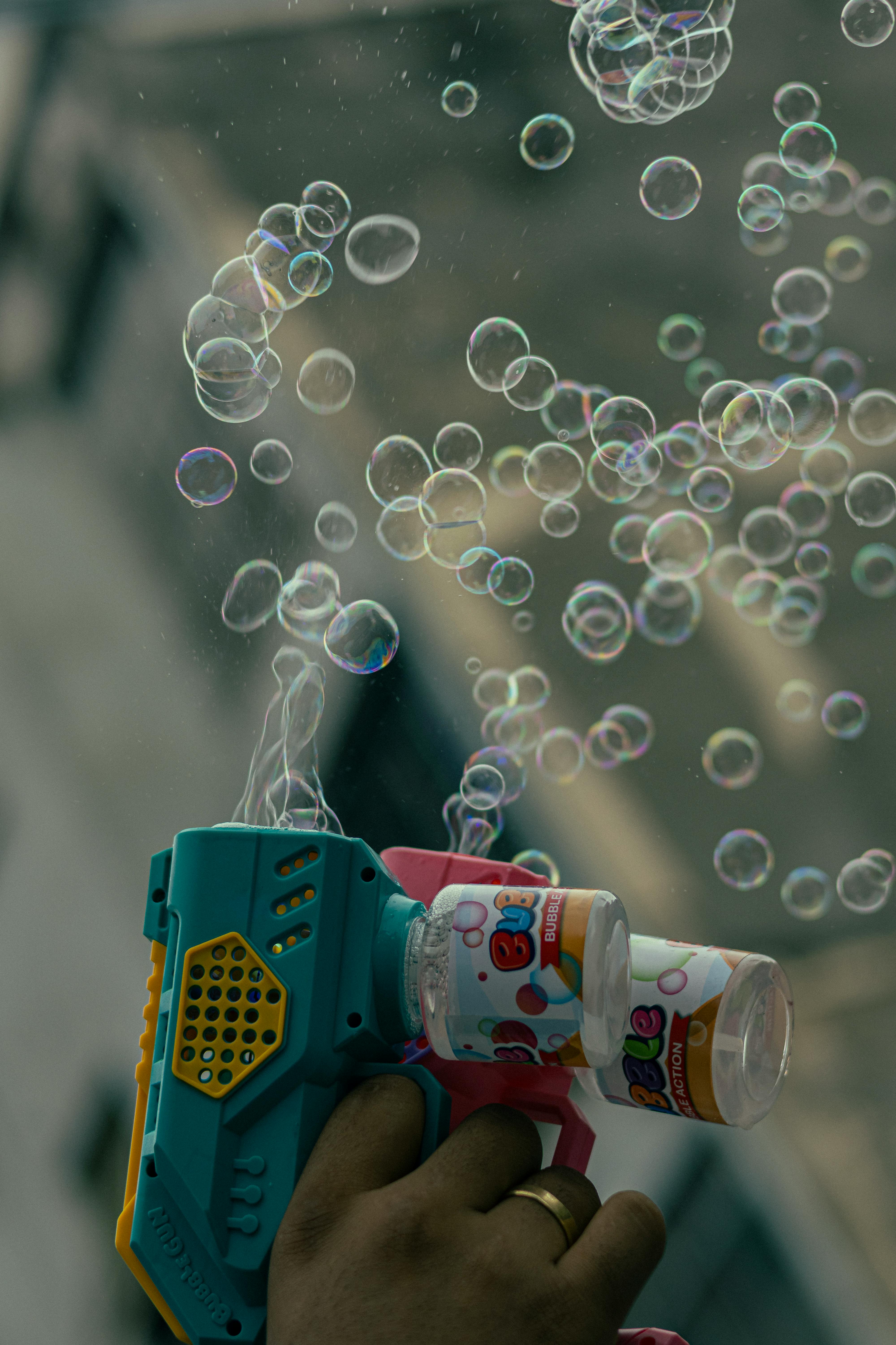 - "A person is holding a blue and yellow toy bubble gun in their right hand" by FM-k8YU92, licensed under CC BY 4.0