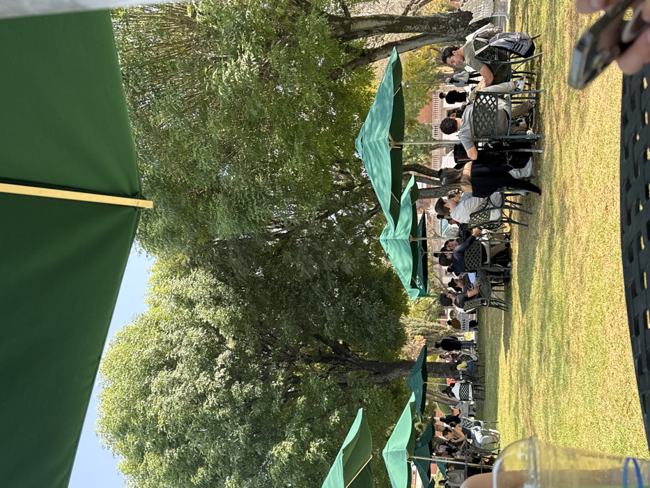 People are seated outdoors under green umbrellas, arranged in rows on a lawn. Large trees provide shade, and a building is visible in the distance. Some individuals are engaged in conversation, while others appear to be focused on their tasks. The scene suggests a relaxed, social gathering or an outdoor study session. A table and drink are visible in the foreground.