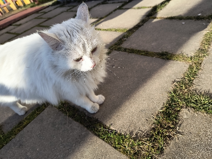 - "The scene depicts a long-haired domestic cat, predominantly white with subtle light grey tabby markings on its head and ears, standing on a paved outdoor surface in the city of Razgrad, Bulgaria" by FM-vPaoz2, licensed under CC BY 4.0