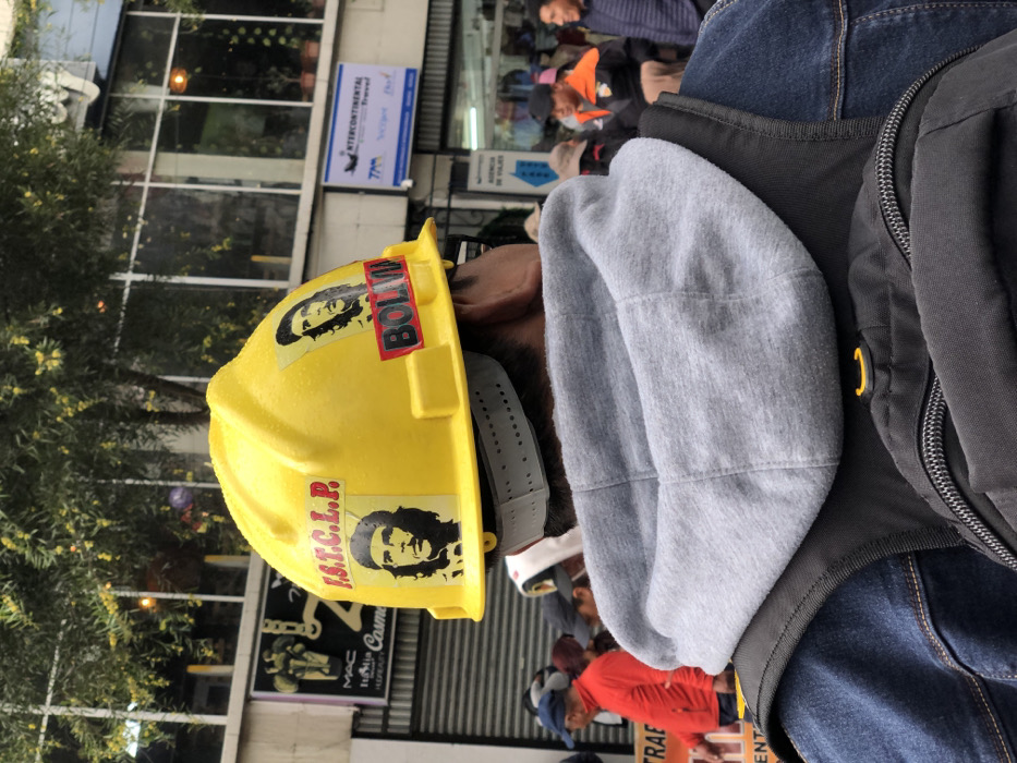 - "The image depicts the back of an individual wearing a yellow hard hat adorned with multiple stickers, standing on a commercial street in La Paz, Bolivia" by FM-OkUX82, licensed under CC BY 4.0