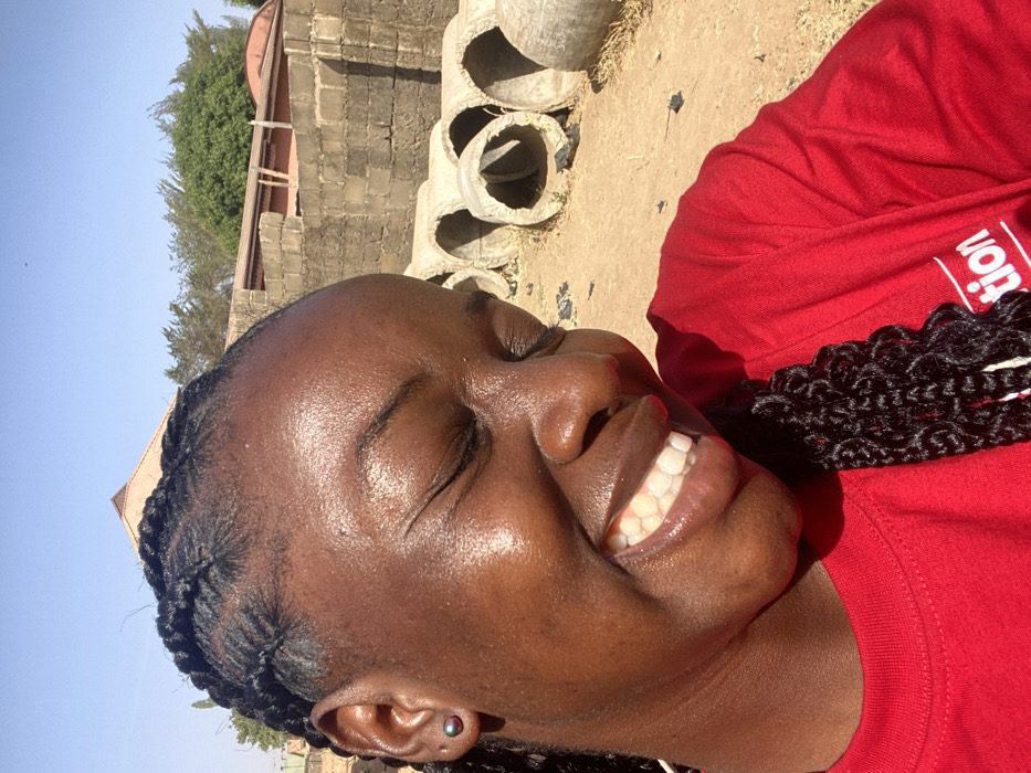 A close-up portrait shows a young adult female with dark skin, her head tilted slightly, filling the foreground of the image. Her eyes are closed, and she displays a broad smile, revealing her upper and lower white teeth. Her hair is styled in cornrows pulled back from her face. She wears a black stud earring in her visible left ear. A sheen is visible on her forehead, cheeks, and nose. She is wearing a red short-sleeved t-shirt, with a partial white word, "tion", visible on the right side of her chest. The background, under a clear blue sky, features a dry, reddish-brown dirt ground. Several weathered concrete pipes of varying sizes are visible, lying horizontally on the ground behind the subject. Beyond the pipes, a wall constructed from grey concrete blocks is present. Further in the distance, parts of a building with a reddish-brown roof and green foliage from trees are discernible. The scene is outdoors and well-lit by direct sunlight. This image was captured in Sabon Tasha, Nigeria.