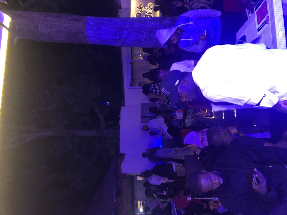 A dimly lit outdoor scene shows a gathering of people at "Palm Wine