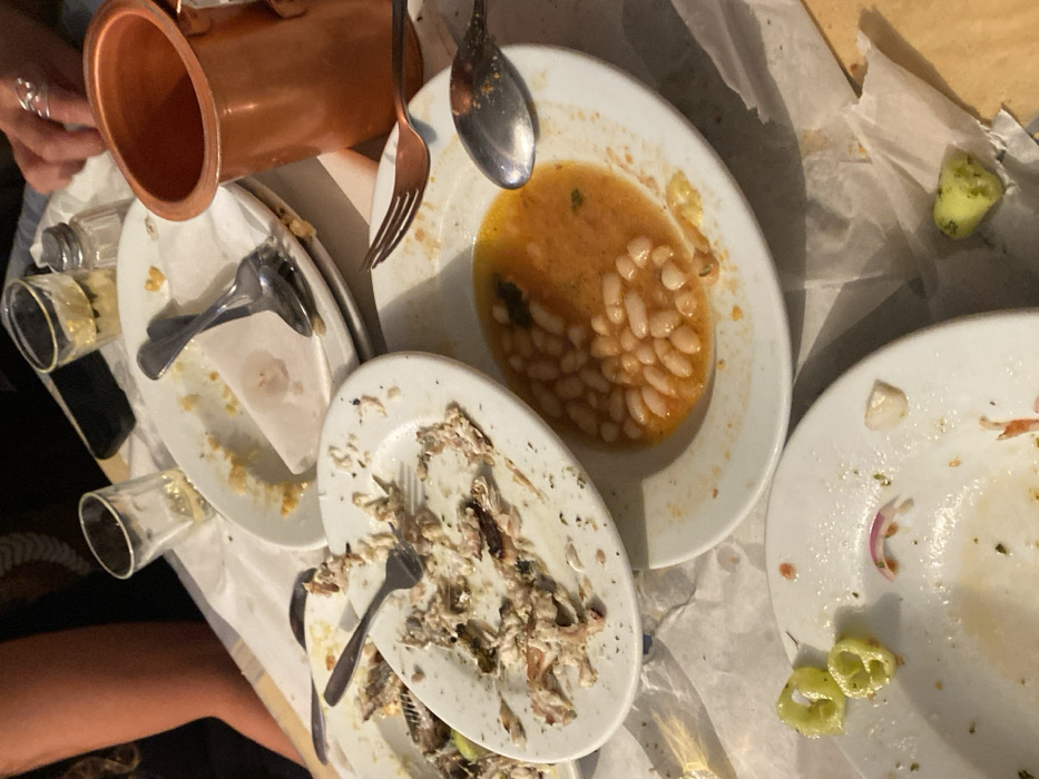 The image depicts a dining table in a casual restaurant or taverna in Athens, Greece, after a meal
