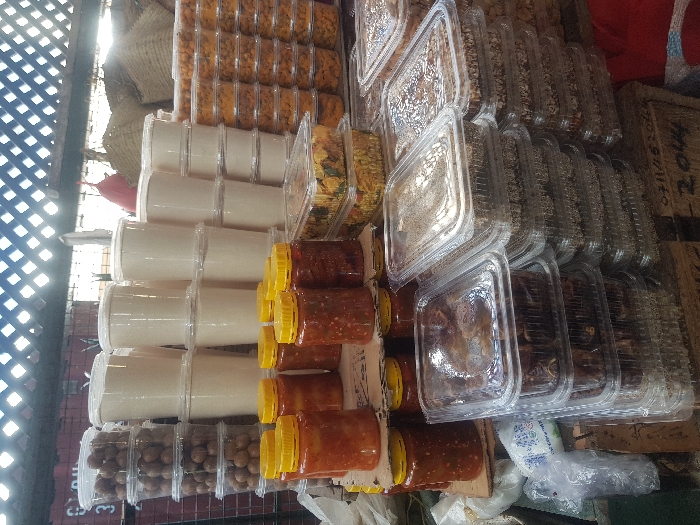 The image displays a static close-up of a market stall in Mombasa, Kenya, featuring a densely packed arrangement of various packaged food items. No individuals are visible. In the left foreground, multiple clear plastic containers are stacked, each filled with numerous spherical, light-brown nuts, resembling macadamia nuts. Adjacent to these, a prominent display of glass jars with yellow screw-top lids contains a reddish-orange, textured substance, consistent with a relish, chutney, or pickled item. Below these jars, further clear plastic rectangular containers are stacked, containing dark, possibly dried fruits or dates. Centrally, tall, opaque white plastic containers with clear lids are stacked in columns, likely holding dry goods such as flour or spices. To the right, numerous clear plastic rectangular containers are stacked high, filled with small, irregularly shaped, orange-brown savory snacks. Further right and slightly behind, additional clear containers display lighter-colored, finely ground substances, possibly spices, and other textured snacks. The items are displayed on wooden surfaces, including what appears to be repurposed wooden crates, one of which in the lower right corner bears handwritten numbers: "0711452044" and "2044". The background reveals a white lattice-like structure, indicative of a covered market area, with a reddish-brown wall or structure partially visible behind it, suggesting an indoor or sheltered outdoor setting.