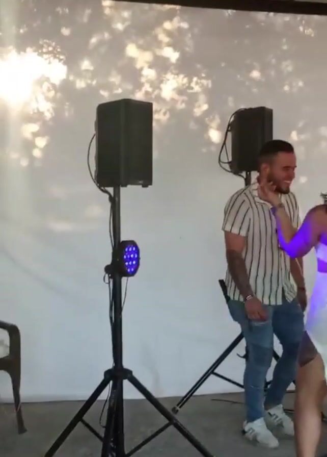 A medium shot shows a man and a woman dancing in front of DJ equipment