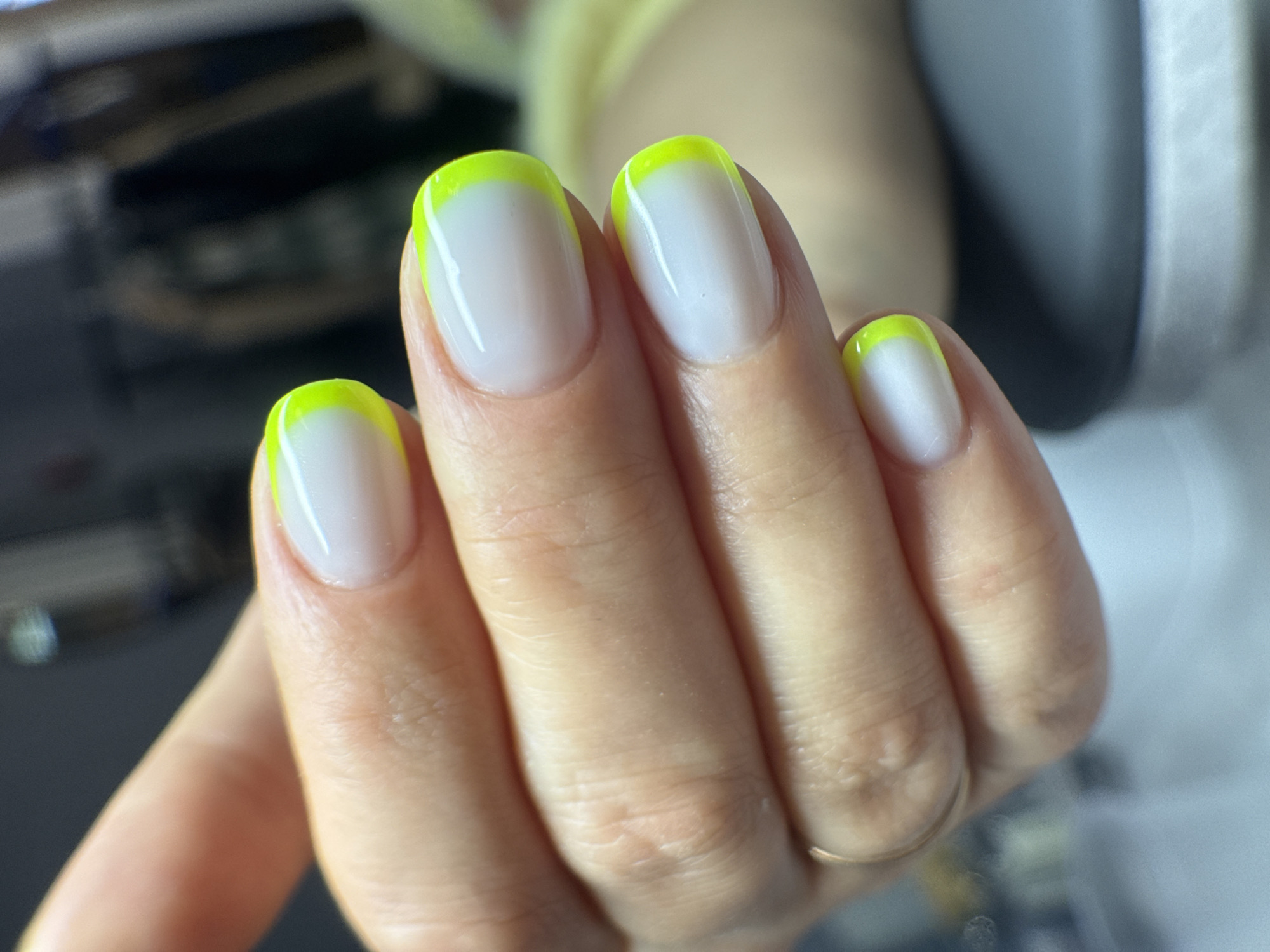 A close-up shot shows a hand with four fingers visible. The fingernails are painted in a white base with a vibrant neon yellow French tip design. The skin tone of the hand is light. The background is blurred and appears to be indoors. The city of Chaikovsky, Russia is not discernable from the image.