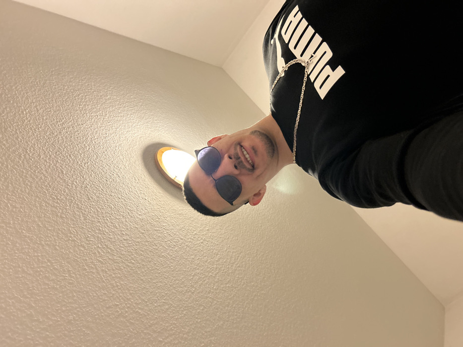 A low-angle, rotated view features a smiling person wearing dark sunglasses and a black Puma sweatshirt with a silver chain. The background is a plain wall with a circular light fixture. The composition is tilted, placing the subject diagonally across the frame, creating a somewhat disorienting perspective.