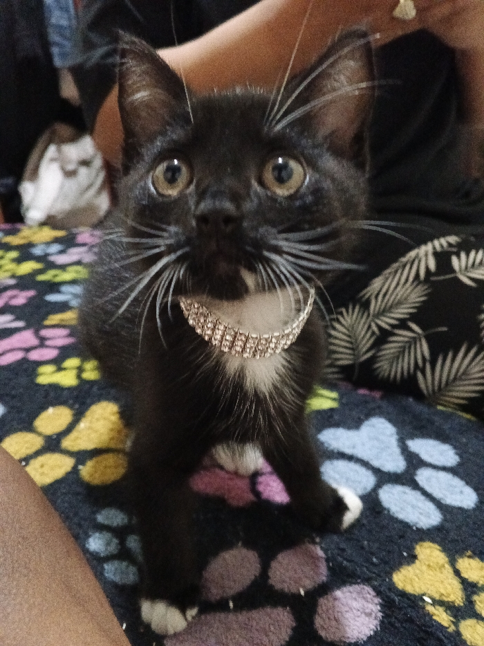 A small black cat with white paws, whiskers, and a patch on its chest sits on a colorful blanket. The cat is wearing a sparkling collar around its neck. Its large, round eyes stare directly at the camera. The background includes a person's legs and a pillow with a palm leaf pattern. A small, blurry object is visible behind the cat, out of focus.