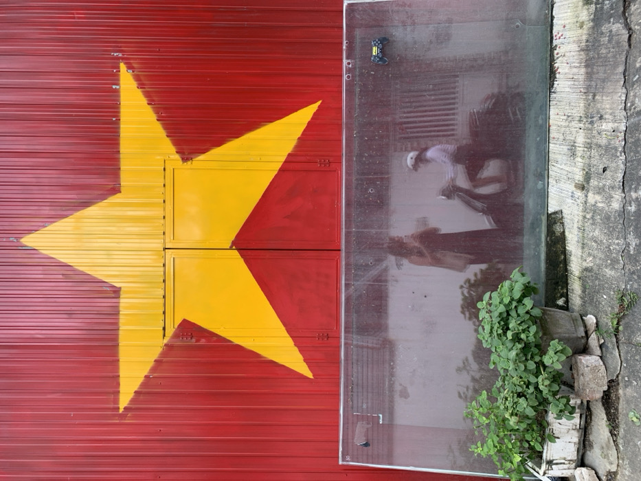 - "A street scene in Nha Trang, Vietnam, features a building with a red, vertically corrugated metal wall displaying a large yellow five-pointed star painted centrally" by FM-p6MFB2, licensed under CC BY 4.0