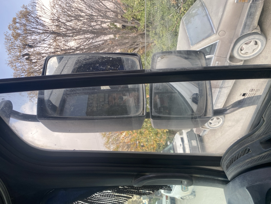 The image presents an exterior view observed from the passenger-side window of a stationary vehicle, identified as a truck, located in Dahiyat Harasta, Syria. The foreground displays a dark grey interior door frame with a black fringed curtain on the left, and a textured portion of the dashboard at the bottom left. Centrally positioned are two stacked, rectangular exterior rearview mirrors, both appearing dusty and smudged. The upper mirror reflects a distant building and indistinct Arabic text, while the lower mirror shows a reflection of a white vehicle. The window glass itself exhibits dirt and water spots. Outside the vehicle, an unpaved, dusty road or path is visible. Multiple vehicles are parked along this path. To the far left, a white small car, possibly a compact model, is partially visible facing away. Closer to the center, a white vehicle resembling a Kia Soul, with a damaged front bumper and a visible license plate including the numbers "3169," faces towards the viewer. To the right, an older model brown sedan, heavily coated in dust, is parked facing away. The tires and hubcaps of the sedan are also dust-covered. The surrounding environment consists of sparse vegetation, predominantly deciduous trees with mostly bare branches, indicating a cooler season. One tree on the left has visible yellowish-green leaves. The background features a light blue sky with scattered clouds. No individuals are visible, and no dynamic actions are depicted.