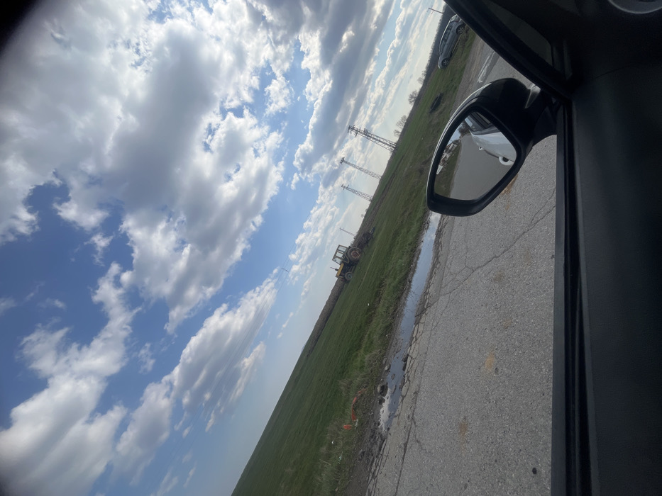 The image depicts an outdoor rural or semi-rural scene in Sredna mahala, Bulgaria, captured from the interior of a vehicle. The perspective is through the passenger-side window, angled upward and to the left. The sky occupies the upper two-thirds of the frame, displaying a vibrant blue with numerous white and light grey cumulus clouds scattered across it. In the mid-ground, a wide, undulating green field stretches across the landscape. Positioned within this field, a yellow and orange tractor with an attached implement, possibly for tilling or plowing, is visible. Extending horizontally through the field is a long, dark, elevated ridge or mound of earth. Near the foreground edge of the field, adjacent to the road, an orange piece of discarded material or construction debris is present. The immediate foreground features a section of an asphalt road with visible cracks, divots, and several irregular puddles reflecting the sky. To the far right, part of a vehicle's black side mirror and the upper portion of a black car door panel are visible. The mirror reflects a portion of the vehicle's white body and a glimpse of the road behind it. In the background, three distinct tall, lattice-structured metal towers, characteristic of electricity transmission, ascend from the field. Further to the right in the distant background, a grey SUV-style vehicle is parked or stopped on the side of the field or an unpaved track. The horizon also shows a distant line of trees. No individuals are visible in the scene.