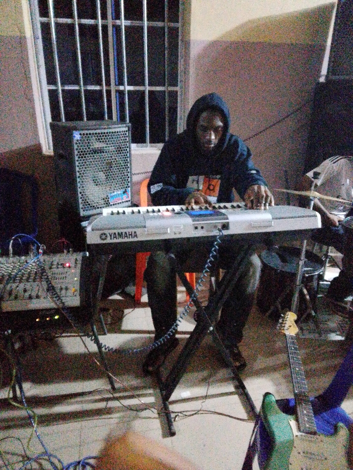 A man in a hoodie sits at a Yamaha keyboard, his hands poised to play. A mixing board sits to his left, connected by numerous blue cables. A speaker stands behind the keyboard, and a guitar leans against the keyboard stand. In the background, a drum set and other musical equipment are visible. A window with a barred frame hangs behind the speaker.