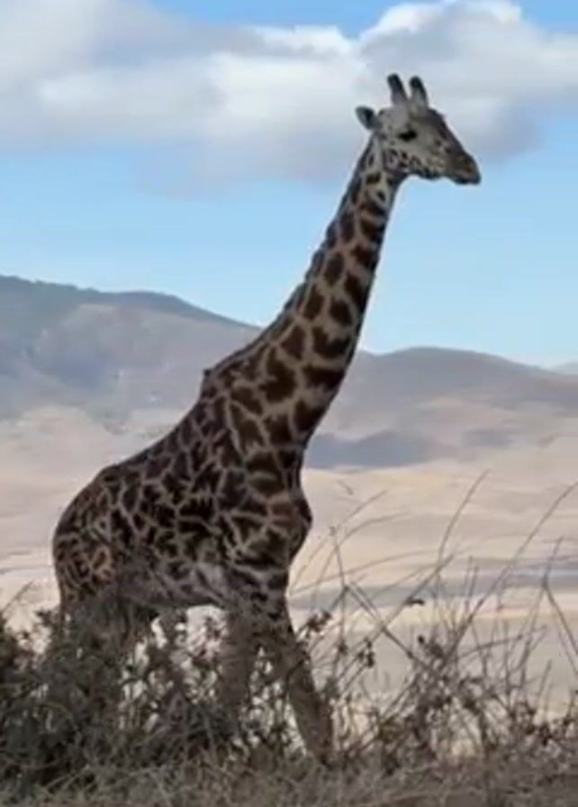 giraffe standing on a dry grassy hill. Behind the giraffe, there is a landscape with mountains and a blue sky with scattered clouds. The giraffe is mostly standing still, occasionally moving its head.