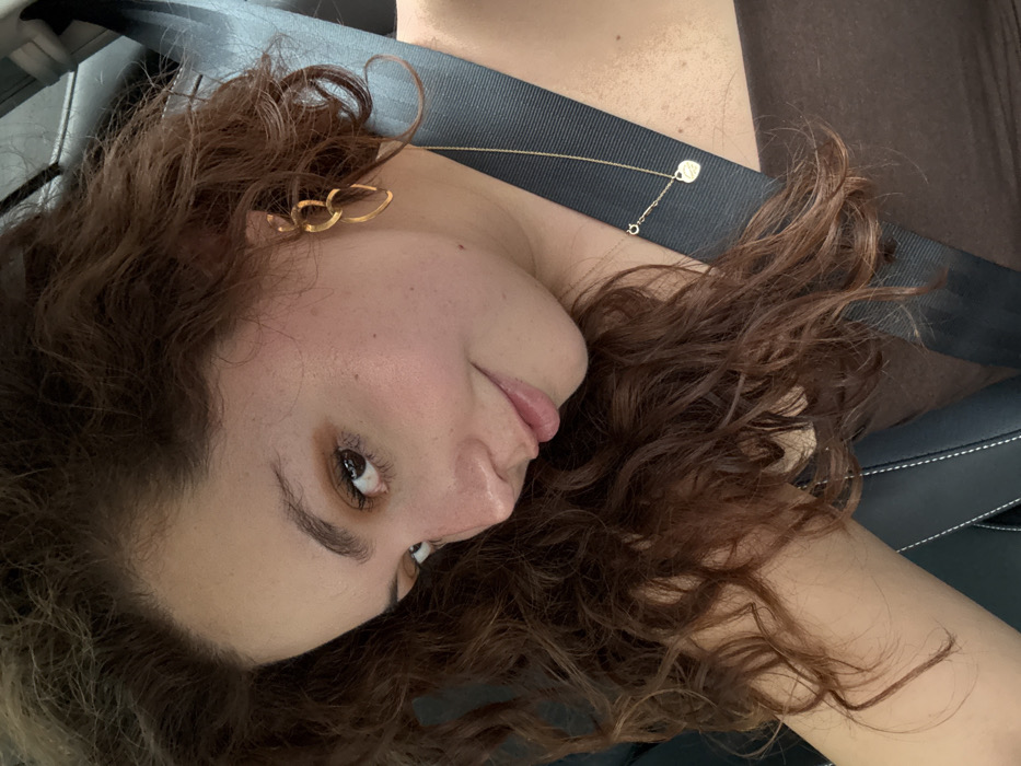 A forensic description of the image reveals a woman with medium brown, curly hair and fair skin, occupying the passenger seat of a vehicle in Mexico City, Mexico. She is depicted from the chest up, positioned at an angle, looking directly at the camera with a subtle smile. Her right shoulder and chest are visible, crossed by a dark grey seatbelt. She wears a dark brown, strapless top. Adornments include a gold-toned, multi-loop earring on her right ear and a delicate gold-toned necklace with a small, flat, irregularly shaped pendant. Makeup, including brown eyeshadow, is visible on her eyelids. The interior of the vehicle is identifiable by a black seat with white stitching visible on the left side of the frame.