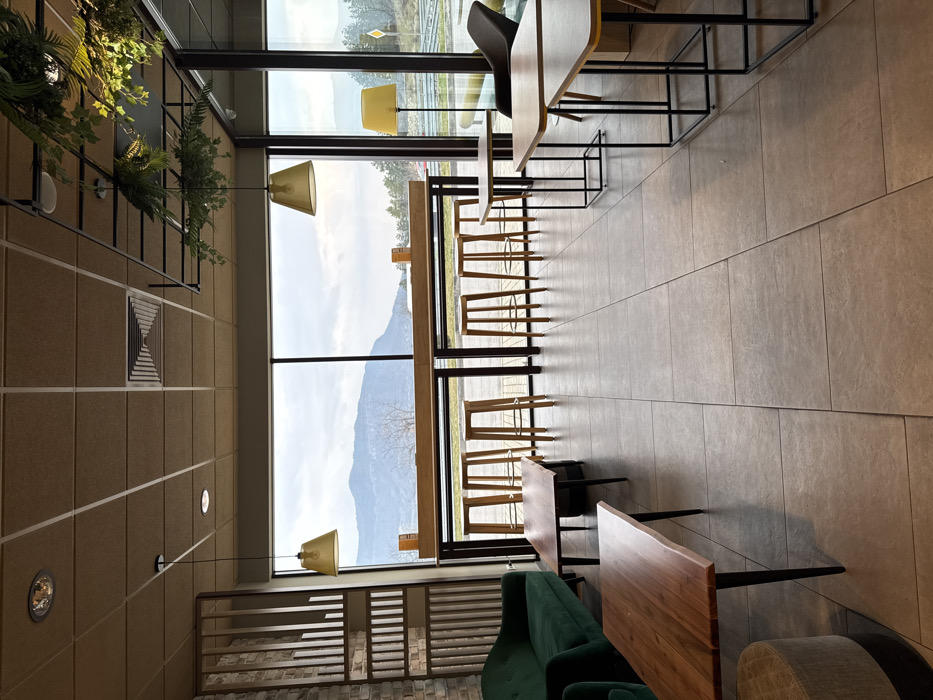 The image depicts the interior of an unoccupied cafe or restaurant located in Yablanitsa, Bulgaria, presenting a view of mountains and a highway through large windows