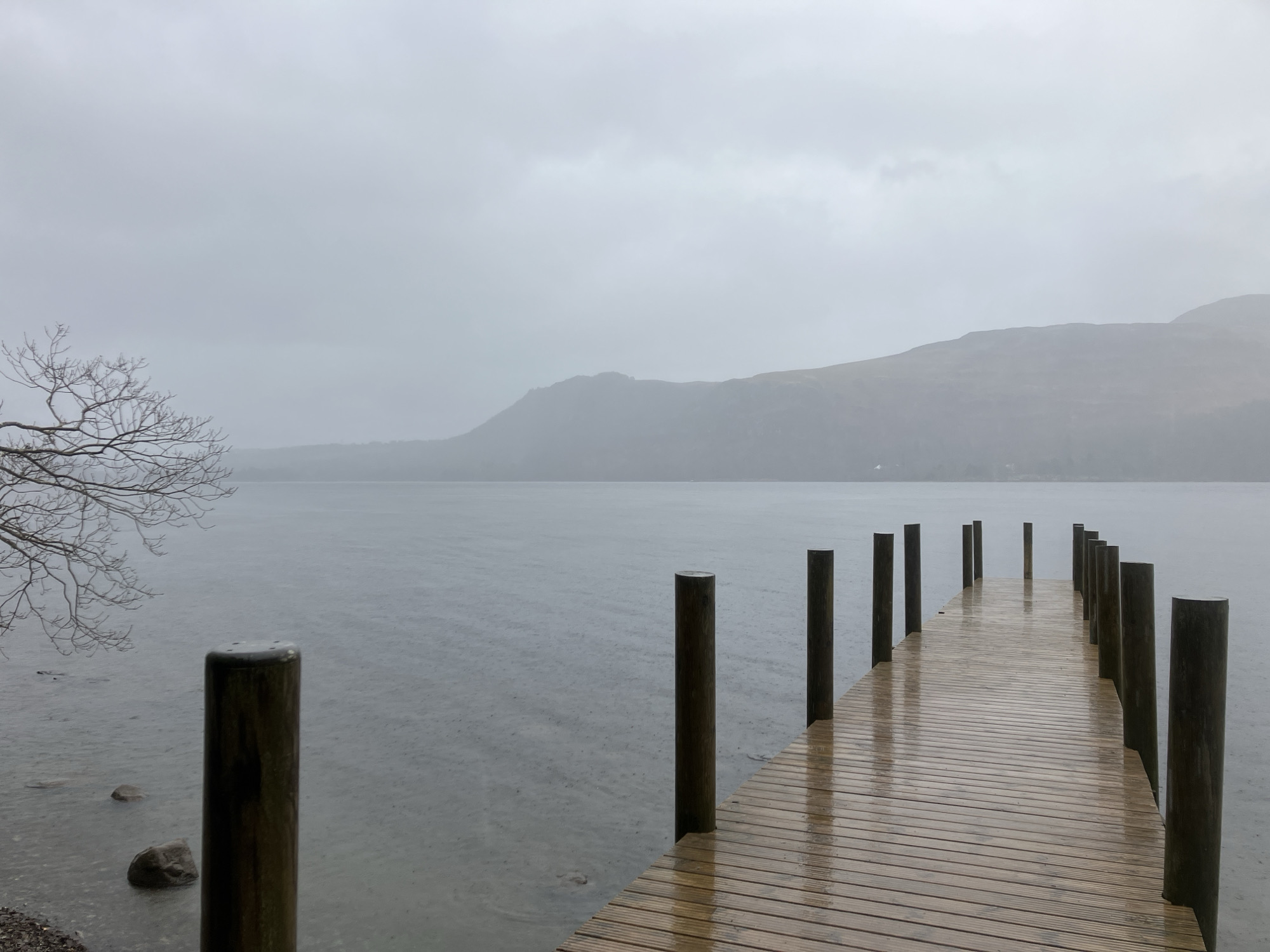 This image presents an overcast, rainy landscape featuring a lake and a wooden jetty, stated to be located in Grange, United Kingdom