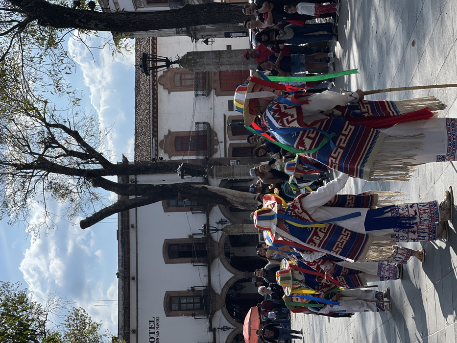 A group of dancers in colorful traditional clothing, including hats and patterned shawls, performs in a plaza