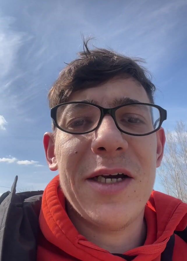 A man wearing glasses and a red hoodie addresses the camera, stating that he is going to jog. The camera angle looks up at him, with a cloudy, blue sky in the background. He appears to be outside.
