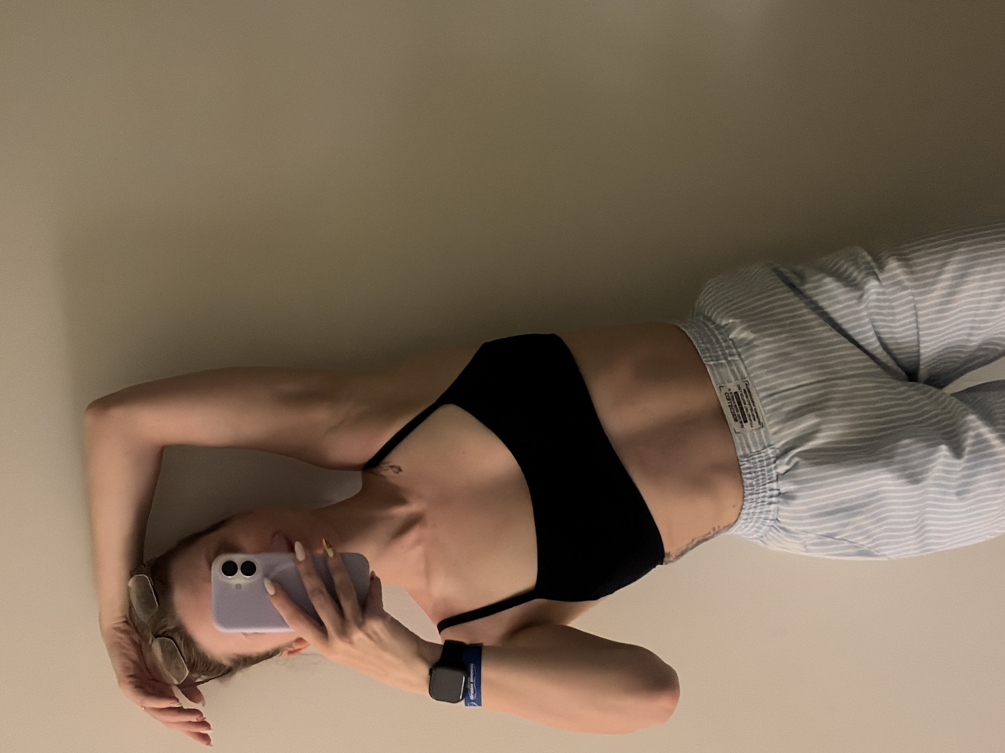 A woman with blonde hair is lying down and taking a selfie with a purple iPhone. She is wearing a black bralette and blue and white striped pajama pants. She also has a watch and blue wristband on her left wrist. There are two objects in her hair. The background appears to be a plain, light-colored wall. There is no information available to ascertain if the image was taken in Sharm El Sheikh, Egypt.