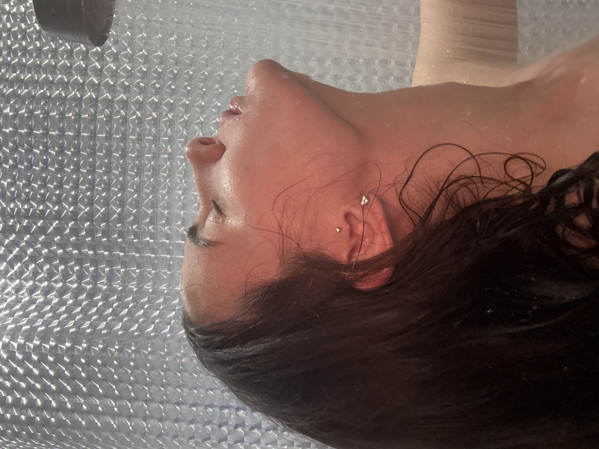 woman in a shower. She is facing upwards with her eyes closed. The showerhead is visible at the top left of the image. The shower walls are covered in a textured, reflective material. The woman has dark hair that is wet. She has a double piercing in her ear. The location of the image cannot be determined based on the given information. The city of Chaikovsky, Russia is irrelevant to the content of the image.