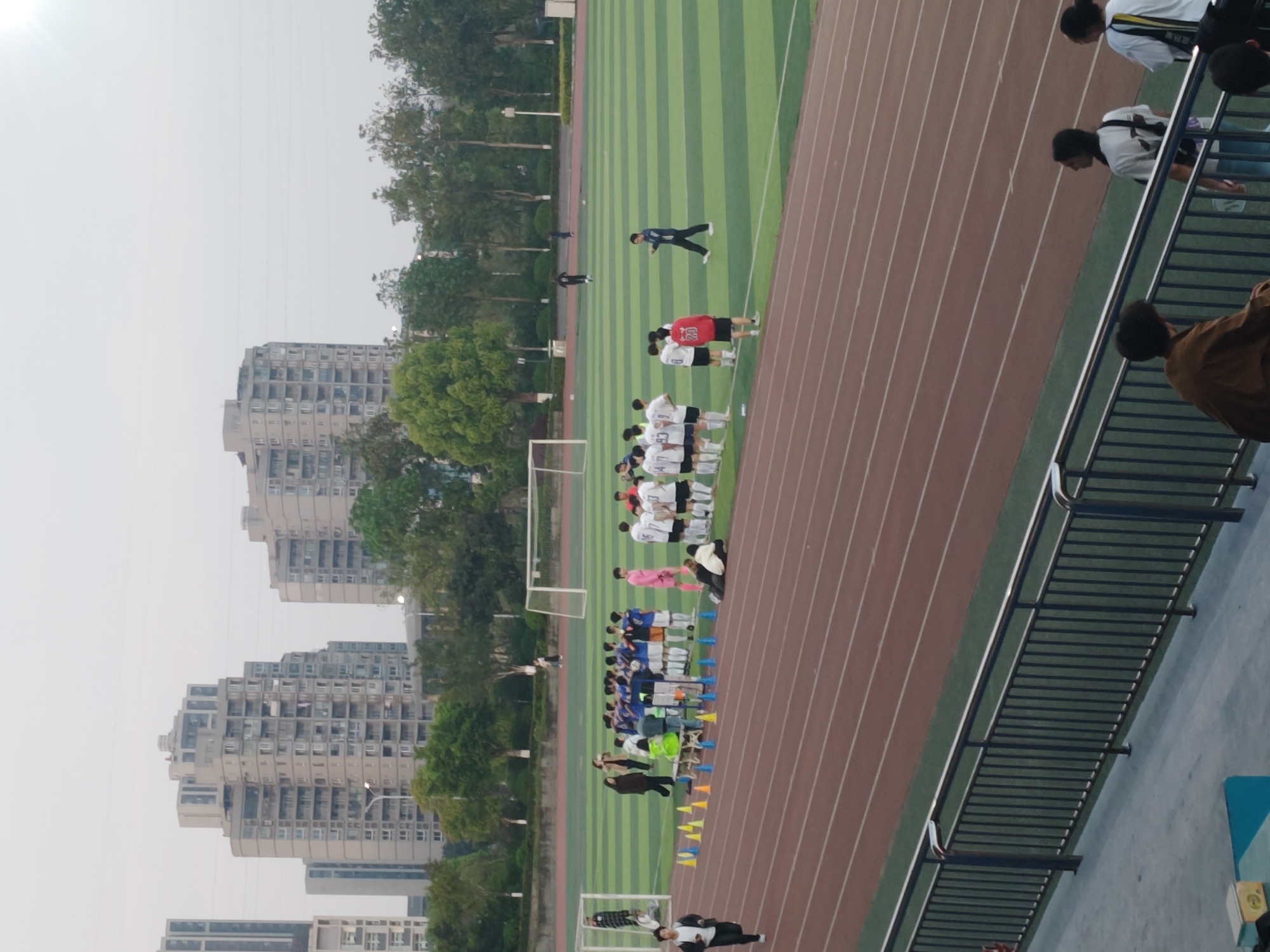 The image depicts an outdoor sports complex, specifically a soccer field and running track, located within the Chongqing High-tech Zone, China. The scene unfolds under an overcast or hazy sky, suggesting late afternoon or early evening light conditions. In the background, multiple tall, multi-story residential or commercial buildings, predominantly grey in color, rise above a line of green trees and bushes, indicating an urban environment. Two large white soccer goals are positioned on the artificial turf field. The field itself features alternating stripes of light and dark green, while a red-brown running track with multiple lanes encircles it. On the soccer field, a significant group of approximately 25-30 young individuals, primarily male, are gathered. Many are dressed in various soccer uniforms including white, blue, black, pink, and red. Several small clusters of players are visible, some appearing to be in huddles or receiving instructions. One player in a pink uniform stands prominently, while another in a red jersey with the number "23" on the back is also visible. Several adults, possibly coaches or staff, are present among the players; one male adult in a dark blue tracksuit is walking on the green turf. Near the left goal, a person in dark clothing stands within the goal area, and another individual in white walks from left to right on the adjacent running track. In the foreground, a dark grey metal railing separates a spectator area from the running track. A young man in a white long-sleeved shirt and dark pants is captured mid-stride, running on the running track from left to right. A line of yellow and orange training cones, along with blue markers and a blue/white bench, are arranged on the running track near the assembled players, indicating ongoing training or a planned drill. In the lower right foreground, several individuals are partially visible in what appears to be a spectator seating area behind the railing, observing the activity on the field.